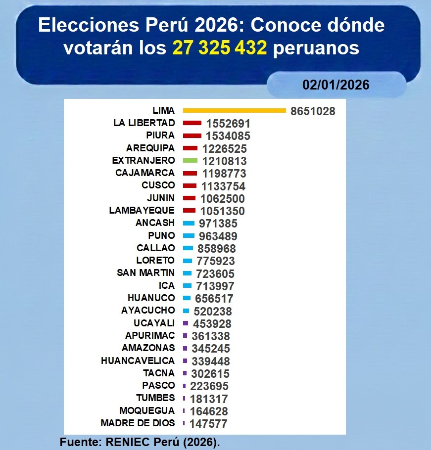 A menos de un año de las Elecciones Generales 2026, el padrón electoral revela no solo dónde votarán los 27 325 432 peruanos habilitados, sino también las profundas asimetrías territoriales que siguen marcando el sistema democrático del país. De acuerdo con cifras oficiales de RENIEC, Lima concentra 8 651 028 electores, casi un 32 % del total nacional, consolidándose como el principal eje de decisión política. Le siguen La Libertad (1 552 691), Piura (1 534 085) y Arequipa (1 226 525), mientras que el voto en el extranjero alcanza 1 210 813 ciudadanos, una cifra que ya supera a varias regiones del país.