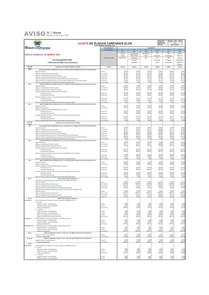 Electro Oriente: Ajustes de Pliegos Tarifarios Elor
