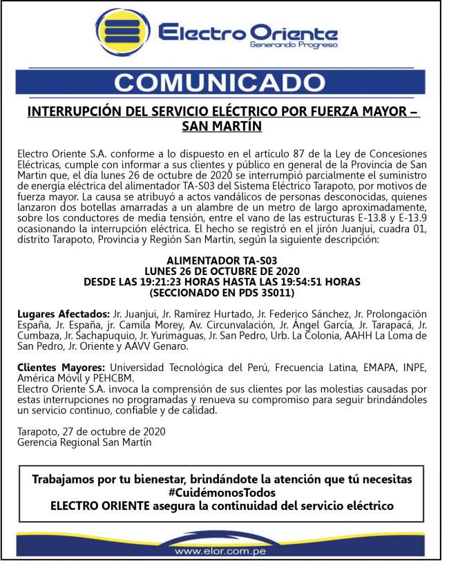 Electro Oriente Comunica: INTERRUPCIÓN DEL SERVICIO ELÉCTRICO POR FUERZA MAYOR – SAN MARTÍN