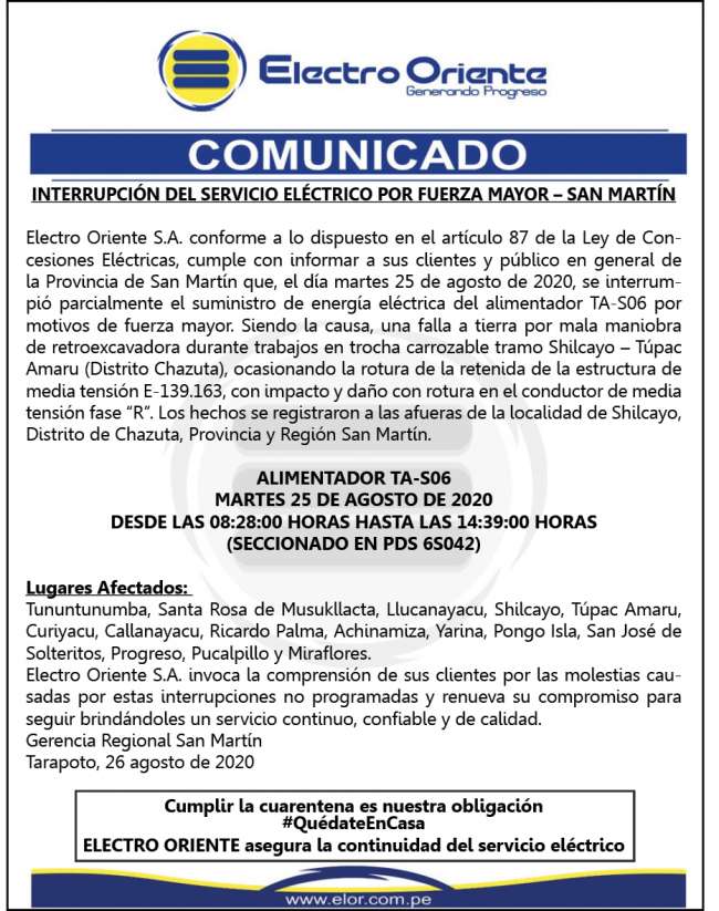 Electro Oriente Comunica: INTERRUPCIÓN DEL SERVICIO ELÉCTRICO POR FUERZA MAYOR – SAN MARTÍN