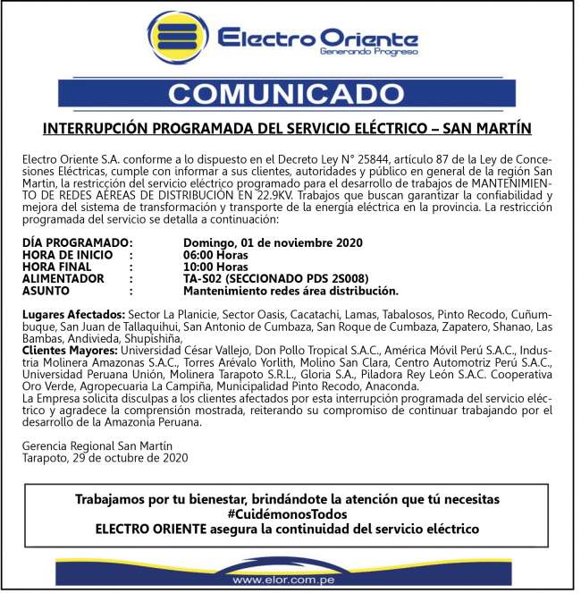 Electro Oriente Comunica: INTERRUPCIÓN PROGRAMADA DEL SERVICIO ELÉCTRICO – SAN MARTÍN