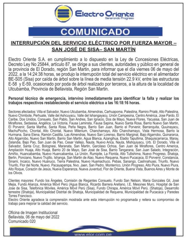 Electro Oriente: Comunicado Interrupcion del Servicio Eléctrico San José de Sisa – San Martín
