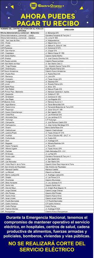 Electro Oriente informa: Lugares de pago de recibo de luz Bajo Huallaga