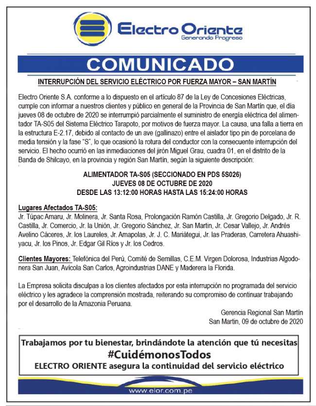 Electro Oriente: INTERRUPCIÓN DEL SERVICIO ELÉCTRICO POR FUERZA MAYOR – SAN MARTÍN