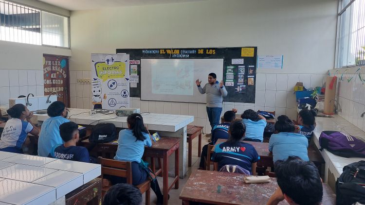 El Ing. Jeferson Reyes, del área comercial de la empresa, fue el encargado de brindar orientación a los alumnos del nivel secundario del referido colegio a través de videos ilustrativos sobre riesgos eléctricos, uso eficiente de la energía eléctrica, conociendo mi recibo de luz, etc.