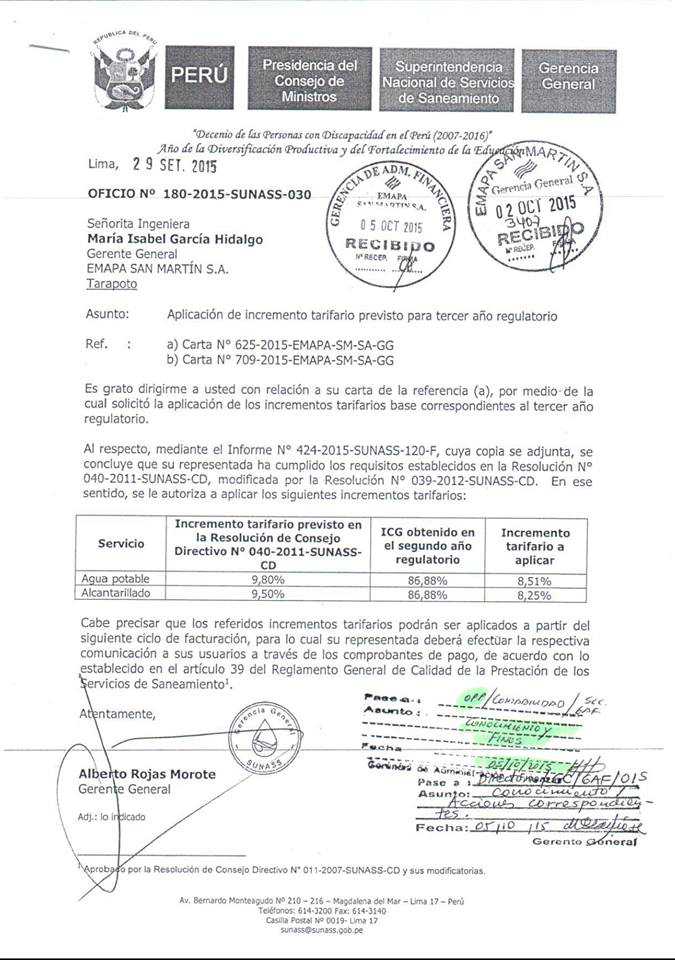 La Empresa Municipal de Agua y Alcantarillado EMAPA San Martín, realizó un incremento en las tarifas a los usuarios en 8,25 para agua y 8,51 para alcantarillado.