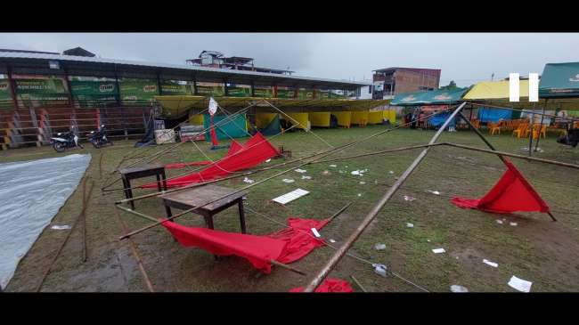 Un grupo de emprendedores que viene participando en la feria al interior del estadio del distrito de Morales, como parte de la programación por los 366 aniversario, denunciaron públicamente el abandono que actualmente vienen sufriendo, esto luego que la madrugada de este viernes durante la fuerte lluvia con ventarrones, la misma que destruyo más de 25 puestos de venta, afectando sus productos y equipos que venían utilizando en sus stands exigieron a los organizadores responsabilizarse este hecho provocado por la misma Naturaleza.