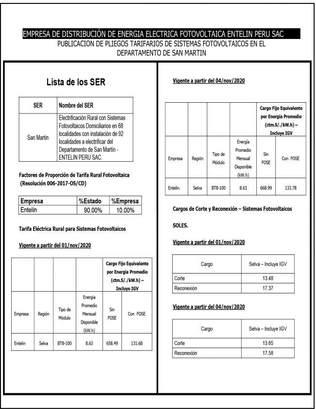 PUBLICACION DE PLIEGOS TARIFARIOS DE SISTEMAS FOTOVOLTAICOS EN EL DEPARTAMENTO DE SAN MARTIN