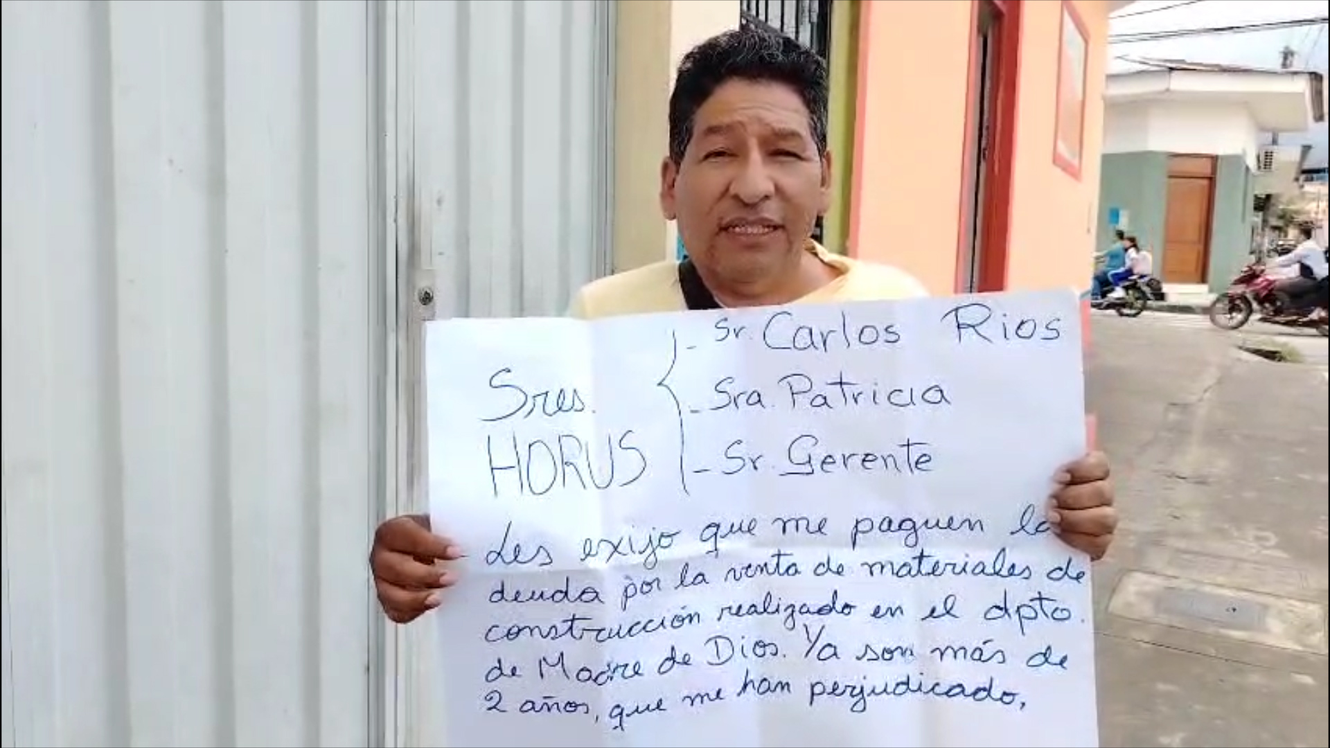 Un empresario identificado como Marcos Santiago Yana Huilca llegó hasta la ciudad de Tarapoto, procedente de Madre de Dios, con el objetivo de cobrar una deuda pendiente por parte de la empresa Horus, de origen sanmartinense. Según indicó, la deuda corresponde a la venta de materiales de construcción que entregó hace varios meses, pero hasta la fecha no ha recibido ningún pago.