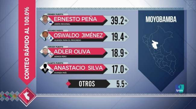 En la Provincia de San Martín, Tarapoto, la candidata de Somos Perú, Lluni Pera alcanza el 28.4% seguido de Avanza País con Juan Manuel García con el 26.1% Munuel Aguilar de Acción Popular con 18.5%, en el cuarto lugar se ubica Mariquita Reategui con el 12% y otros 15%