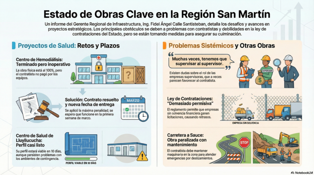En entrevista con VOCES, el Ing. Fidel Ángel Calle Santisteban, Gerente Regional de Infraestructura del Gobierno Regional de San Martín, explicó el estado actual de diversas obras estratégicas para la región, reconociendo dificultades técnicas, administrativas y legales, pero asegurando que se están adoptando medidas para destrabar los proyectos y garantizar su culminación y funcionamiento.