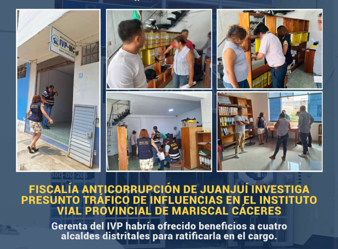La Fiscalía Provincial Especializada en Delitos de Corrupción de Funcionarios de Mariscal Cáceres, con el apoyo de la Dirección contra la Corrupción de la Policía Nacional (Dircocor) de Moyobamba, llevó a cabo la diligencia de constatación, exhibición y recojo de documentos, por un presunto hecho de tráfico de influencias que involucra a la gerenta del Instituto Vial Provincial (IVP) de Mariscal Cáceres Niza Fiorella Isminio Vargas.