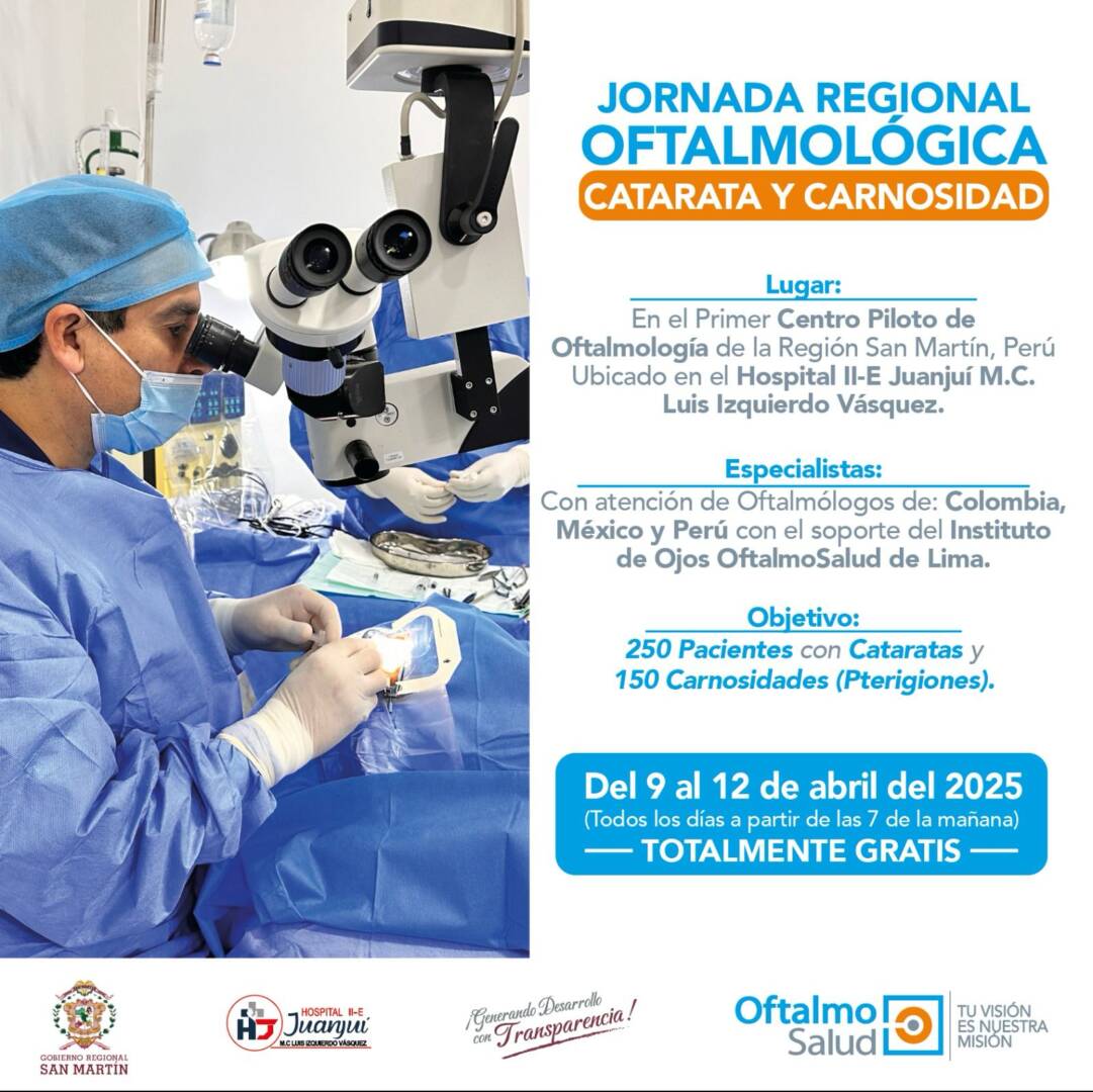 En un esfuerzo por mejorar la salud visual de la población de menores recursos, OftalmoSalud, en colaboración con el Gobierno Regional de San Martín y el Hospital II-E Juanjuí, llevará a cabo la Jornada Regional Oftalmológica de Catarata y Carnosidad, una campaña gratuita que beneficiará a 400 pacientes.