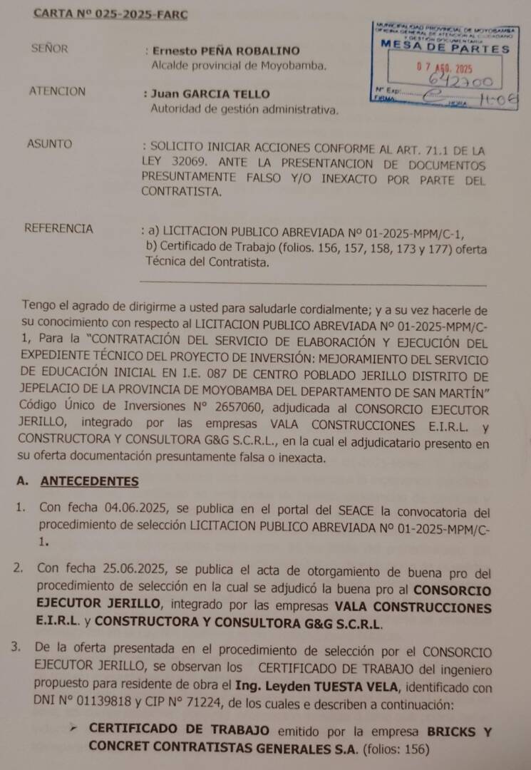 En una grave denuncia remitida al alcalde provincial de Moyobamba, Ernesto Peña Robalino, y a la autoridad de gestión administrativa Juan García Tello, se alerta sobre la presunta presentación de documentos falsos y/o inexactos por parte del Consorcio Ejecutor Jerillo, adjudicatario del proyecto de mejoramiento del servicio de educación inicial en la I.E. 087 del distrito de Jepelacio. El contrato corresponde al Código Único de Inversiones N.º 2657060, y fue aprobado mediante la Licitación Pública Abreviada N.º 01-2025-MPM/C-1.