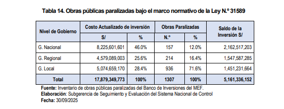 El problema es estructural. Según el Inventario de Obras Públicas Paralizadas del Banco de Inversiones del MEF, bajo el marco de la Ley N.° 31589, el costo actualizado de inversión de estas obras asciende a S/ 17,879,349,773, de los cuales el Gobierno Local concentra el 71.6 % de las obras paralizadas (936 proyectos), seguido del Gobierno Regional con 214 obras (16.4 %) y el Gobierno Nacional con 157 obras (12 %). En términos de dinero, el Gobierno Nacional lidera el monto comprometido con S/ 8,225 millones (46 %), mientras que los gobiernos regionales concentran S/ 4,579 millones (25.6 %) y los gobiernos locales S/ 5,074 millones (28.4 %). El saldo de inversión pendiente supera los S/ 5,161 millones, recursos inmovilizados mientras las necesidades siguen creciendo.