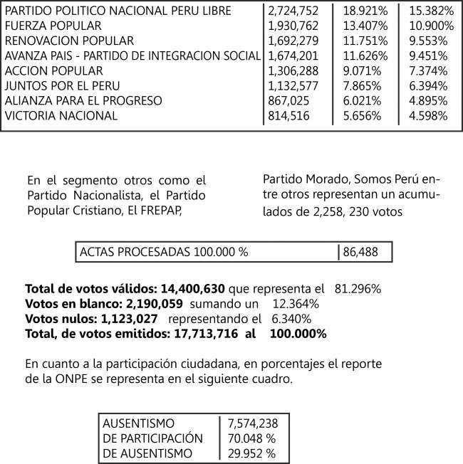 La Oficina Nacional de Procesos Electorales dio a conocer los resultados oficiales del proceso electoral presidencial y congresal de la primera vuelta, resultados al 100% de las actas procesadas y contabilizadas hasta ayer 12 de mayo a las 15:23 horas de la tarde. La ONPE reporta 25, 287,954 electores hábiles. Ciudadanos que votaron llega a los 17,713,716 electores.