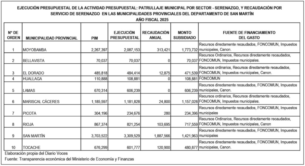 La revisión de la ejecución presupuestal y la recaudación por el servicio de serenazgo en las municipalidades provinciales del departamento de San Martín, correspondiente al Año Fiscal 2025, evidencia profundas diferencias en la forma cómo cada comuna financia y sostiene este servicio clave para la seguridad ciudadana. Las cifras oficiales de Transparencia Económica del Ministerio de Economía y Finanzas, sistematizadas por el Diario Voces, revelan contrastes tanto en montos ejecutados como en niveles de subsidio.