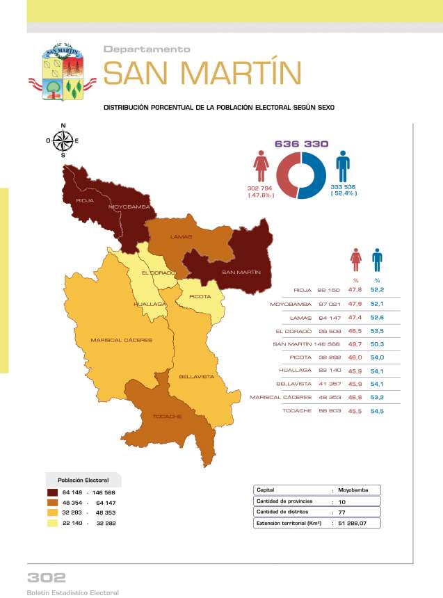 Según datos oficiales de la RENIEC que la provincia con mayor cantidad de electores se encuentra en la Provincia de San Martín –Tarapoto- con 146 mil 568, le sigue la provincia de Rioja con 99,150 y la Provincia de Moyobamba en el tercer lugar con 97, 021 y la menor cantidad en la Provincia del Huallaga con 22 mil 140 electores, además se puede detallar cifras a tomar en cuenta como: