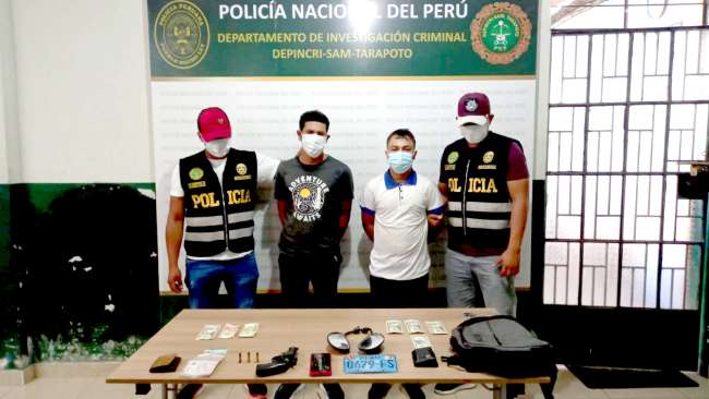 Con la información facilitado en el registro de las cámaras de vigilancia, los efectivos policiales, organizan la operación de rastreo a los presuntos asaltantes, con el cruce e intercambio de informaciones el personal de DIVINCRI, monta un rápido operativo logrando ubicar a los presuntos autores libando licor en Simón Bolívar, una vez ubicados los efectivos policiales, mantienen vigilados a los presuntos asaltantes, esperaron que se trasladen a sus domicilios, siendo intervenidos en el jirón Leticia cuadra cinco, en el Distrito de Morales; ambos sujetos fueron intervenidos abordo de una motocicleta lineal marca Yamaha, se les encontrando un revólver marca Ranger abastecido con tres municiones, la placa de la motocicleta estaba retirada, al momento del registro al venezolano se le se encuentra 81 dólares americanos y 60 soles; según versión del extranjero señala que en el canguro solamente había $261 dólares.