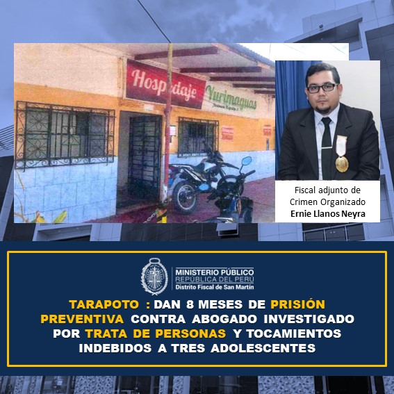 A solicitud de la Fiscalía Provincial Especializada en Delitos de Criminalidad Organizada de San Martín, con sede en Tarapoto, se dictó ocho meses de prisión preventiva contra un abogado identificado como Wilbert Idrogo Espinoza (36), quien usaba el alias de ‘José Neyra’, tras ser vinculado con los presuntos delitos de trata de personas con la agravante de explotación sexual y tocamientos, actos de connotación sexual o actos libidinosos sin consentimiento.
