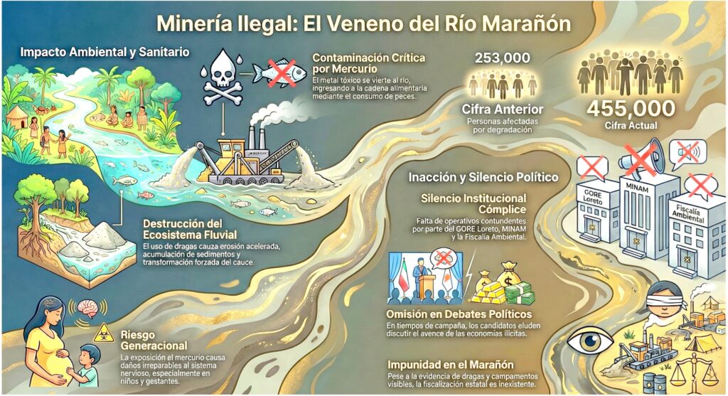 En plena crisis climática, la expansión de la minería ilegal avanza sobre la Amazonía sin freno. Sin embargo, en tiempos de campaña, no son pocos los actores políticos que prefieren evitar el debate sobre un problema que compromete la salud, los derechos humanos y el futuro ambiental.