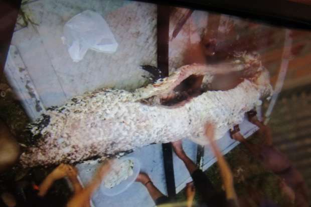 Sauce. Ayer al promediar las 6 de la tarde en el lago Sauce, por el sector el Caño, fue encontrado por moradores del caserío Dos de Mayo, un paiche de 100 kilos y 2 metros con 60 centímetros ya en descomposición, fue picado con arpón a 20 centímetros de su cabeza estos vecinos lo agarraron para llevar al caserío y repartirse entre los vecinos. El caso queda en manos del Ministerio de la Producción y de los pescadores artesanales para seguir las investigaciones y encontrar al responsable de la muerte. (Balmes Valles García)