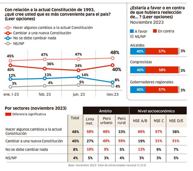 El respaldo a un cambio de Constitución vuelve a crecer en los últimos meses, aunque no llega a ser mayoritario, mientras se ratifica el amplio rechazo a la reelección de congresistas, gobernadores y alcaldes, y a la bicameralidad del Poder Legislativo, según muestra la última encuesta de representación nacional del Instituto de Estudios Peruanos (IEP), investigación realizada con La República.