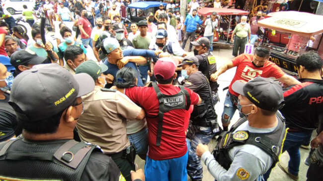 Ayer por la mañana se registró un enfrentamiento entre Policías Municipales de Tarapoto con vendedores informales del barrio Comercio, en momentos que los trabajadores ediles hacían cumplir la ordenanza 019 que prohíbe que los ambulantes vendan sus productos en la vía pública, sin embarga, un grupo de extranjeros opuso resistencia durante la intervención, dejando una persona herida.