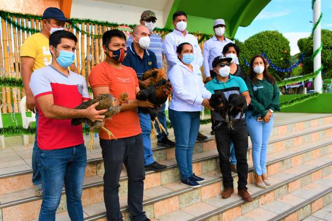 Los módulos constan de 04 gallinas, 01 gallo, vacunas, vitaminas y alimento paletizado; ya fueron entregados a las asociaciones de personas con discapacidad de los distritos de Tabalosos, La Banda de Shilcayo, Chazuta, Morales, Tarapoto, Agua Blanca, Moyobamba y El Dorado; en este último lugar la entrega se hizo el pasado fin de semana, contando con la presencia de la vicegobernadora regional, Nohemí Aguilar Puerta.