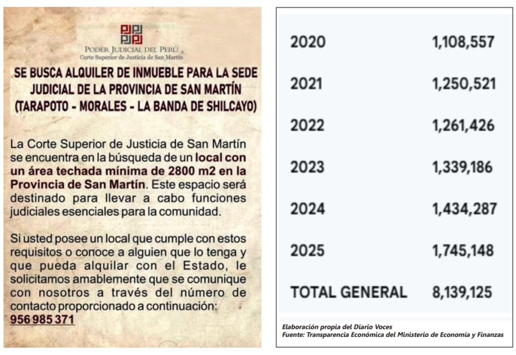 Según una fuente externa, la Corte Superior de Justicia de San Martín enfrenta un déficit significativo, ya que solo tres de sus locales son propios, mientras que 14 sedes operan en locales alquilados.