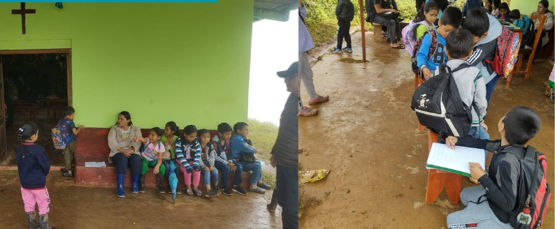 La precariedad de la infraestructura obligó a que las aulas del colegio N.° 14254 sean clausuradas. Como solución provisional, la comunidad educativa habilitó la capilla del cementerio como espacio escolar. En su interior, los alumnos se dividen en grupos de trabajo mientras otros permanecen afuera, sobre bloques de concreto y expuestos al clima de la sierra piurana.
