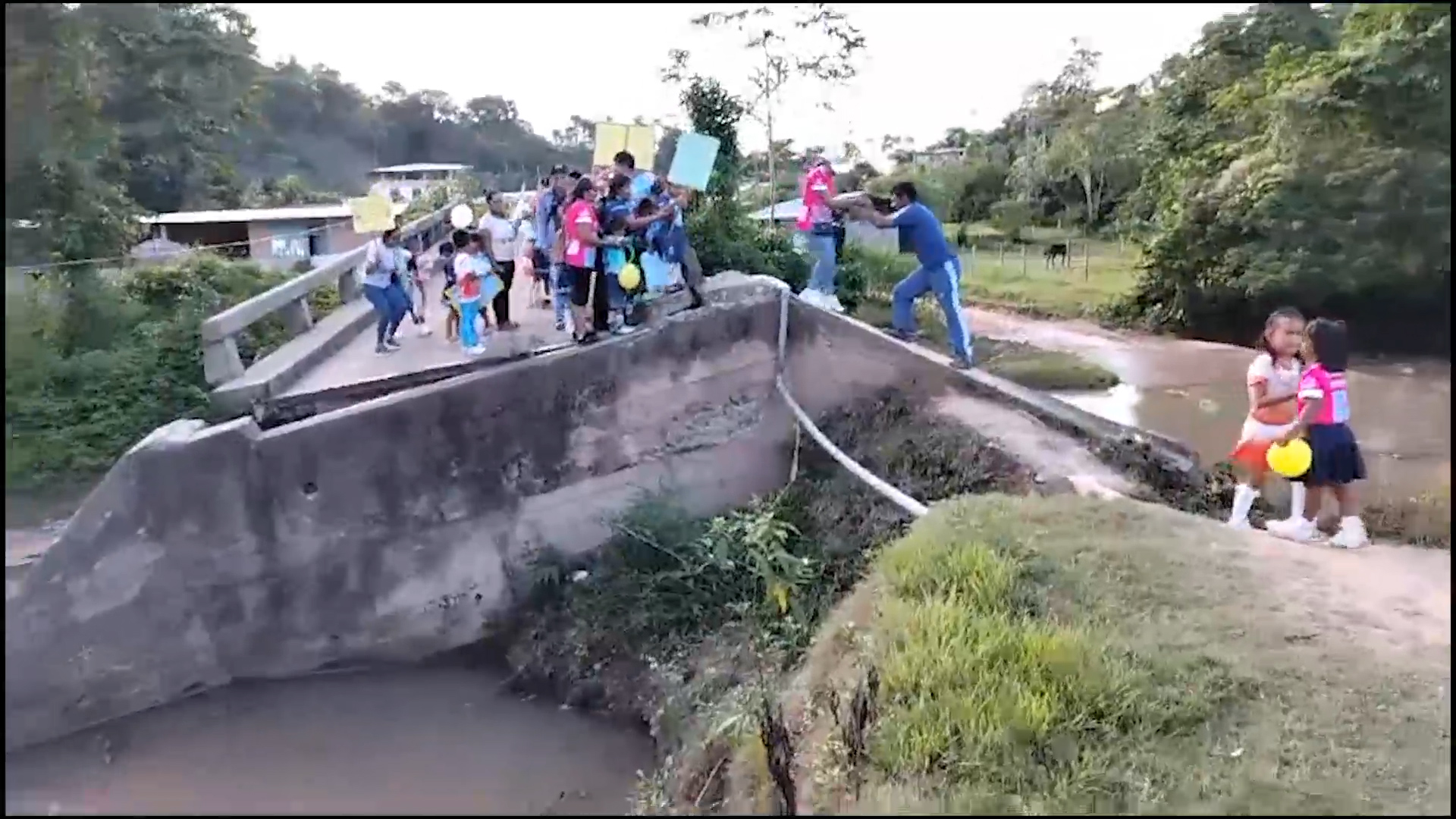 Alumnos de la Institución Educativa Integral Ricardo Palma, ubicada en el centro poblado de Huingoyacu, distrito de San Pablo, provincia de Bellavista, participaron de un desfile en el marco del inicio de las olimpiadas interescolares 2024. Portando pancartas, los estudiantes se vieron obligados a atravesar un puente que colapsó hace 17 años y que aún no ha sido reconstruido por ninguna autoridad.