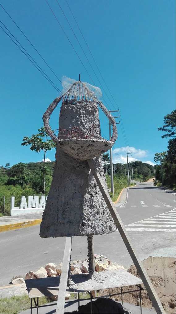 La escultura fue diseñada y está siendo colocada por el artista César Juárez Ramírez quien al mismo tiempo realizan capacitaciones y asistencia técnica a los ceramistas de la comunidad el Wayku, con la finalidad de mantener la identidad cultural local como también fortalecer la marca de la tricentenaria ciudad de Lamas con su lema “Pueblo de Colores, Tierra del Cacao”.