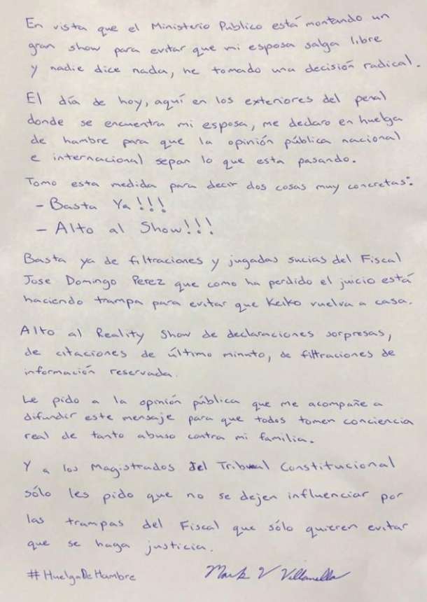 “En vista que el Ministerio Público está montando un gran show para evitar que mi esposa salga libre y nadie dice nada, he tomado una decisión radical. En día de hoy, aquí en los exteriores del penal donde se encuentra mi esposa, me declaro en huelga de hambre para que la opinión pública nacional e internacional sepan lo que está pasando”, se lee en la carta de Vito Villanella que fue dada a conocer por la representante legal de Keiko Fujimori.