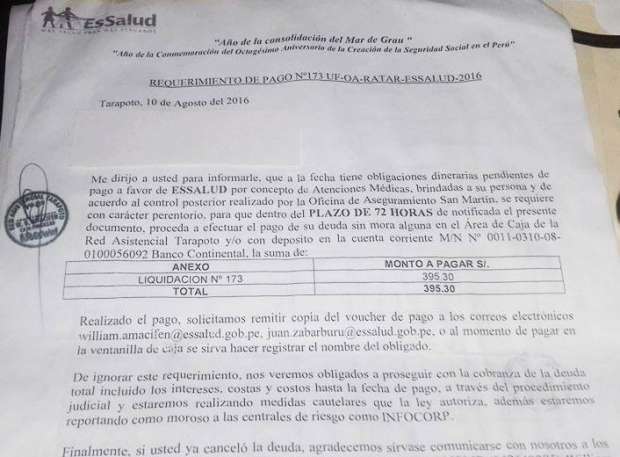 Tarapoto. Los asegurados independientes del seguro social de salud – ESSALUD, recibieron una notificación de pago por el concepto de “prestaciones indebidas”, relacionados a cobros por haber recibido atención médica que no cubre esa modalidad de seguro. Sin embargo, los pacientes notificados se quejan por no haber sido advertidos en ningún momento sobre el costo que representaba los servicios médicos recibidos, como expuso el programa periodístico Decisiones el último sábado.