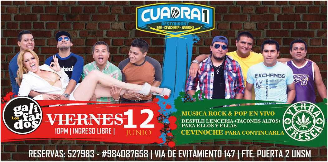 Este Viernes 12 tienes que ir a ver el concierto Rock & Pop y Pachanga que ofrecerán las bandas YERBA FRESCA (FUSIÓN SELVA ROCK) y Los Galifardos en Cuadra 1 a partir de las 10pm.