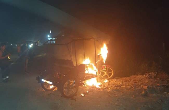 En la avenida Circunvalación Cumbaza, a pocas cuadras de la Ciudad Universitaria, los barristas incendiaron un trimóvil relativamente con poco tiempo de uso, luego que interceptaron a dos adolescentes que participaban en la caravana política de una candidata. Los menores sollozando solicitaron apoyo, lamentablemente fue tarde, el fuego afectó el vehículo.