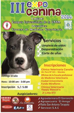 Tarapoto. Con la finalidad de fomentar y mejorar la crianza de animales de compañía, se realizará la III EXPOCANINA 2016, organizado por la Escuela de Medicina Veterinaria de la Universidad Nacional de San Martín, en el marco de la Celebración Semana de la Medicina Veterinaria.