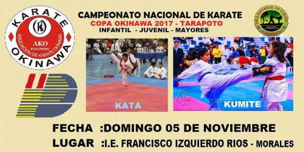 Con el propósito de alcanzar una mejor preparación con miras a torneos internacionales, la Asociación Deportiva Okinawa de Tarapoto organizará para el domingo 05 de noviembre desde las 8 de la mañana hasta las 13 horas el “Campeonato Nacional de Karate “Copa Okinawa 2017-Tarapoto teniendo como recinto el coliseo cerrado de la Institución Educativa Francisco Izquierdo Ríos (FIR) del distrito de Morales.