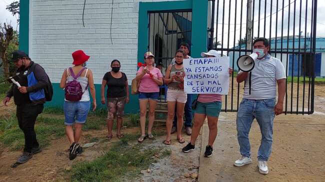 Exigiendo a la Empresa Municipal de Agua Potable y Alcantarillado, administrado por el Organismo Técnico de la Administración de los Servicios de Saneamiento, restablecer cuanto antes el abastecimiento de agua a la población de Tarapoto y Morales con el servicio de agua potable, debido a que llevan más de un mes sin este líquido elemento, un grupo de ciudadanos apoyados por el colectivo Democracia Tarapoto, llegaron a los exteriores de la planta de Emapa a protestar con baldes y ropas sucias las mismas que no pueden lavar.