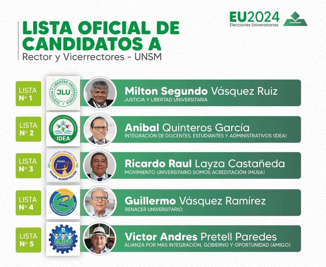 El 31 de octubre se realizará la primera vuelta para la elección de rector y vicerrectores de la UNSM para el periodo 2025-2030.