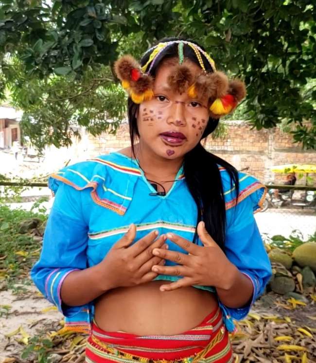 Jaily Pizango Lancha (16), estudiante del 4to de secundaria de la IEP Residencial Técnico Industrial Agropecuario Kumpanamá de la comunidad shawi Progreso del distrito de Balsapuerto, presentó en el TINKUY 2021, los problemas y desafíos del pueblo shawi desde el sentir de los estudiantes.
