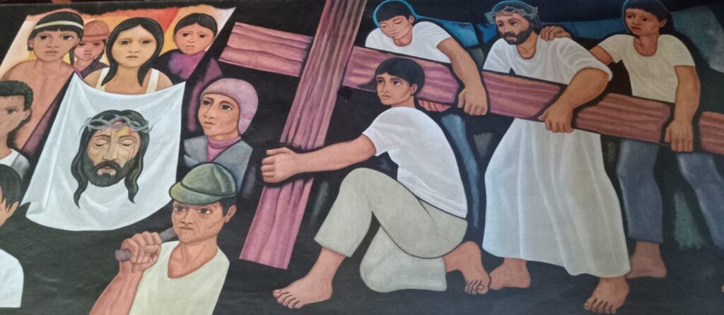 Algo similar ocurre en la Iglesia Matriz de Tarapoto, donde sus murales siguen interpelando a generaciones. Allí, una escena quedó grabada en su memoria: una joven campesina encendiendo una vela no ante el Cristo glorioso, sino ante la madre que lloraba a su hijo muerto. Fue entonces cuando comprendió, como él mismo diría, que la pintura podía ser verdadero vehículo de fe y Buena Noticia.
