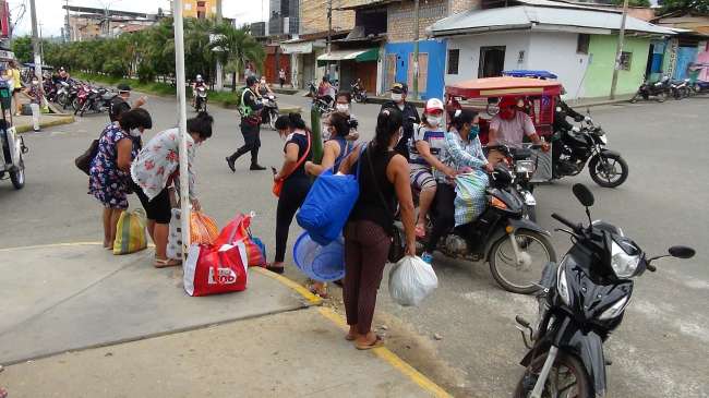 Durante los horarios establecidos por el ejecutivo para que las mujeres puedan transitar hacia los centros de abasto de Tarapoto, se pudo observar el día sábado que la gran mayoría no tienen movilidad para regresar a sus domicilios. Muchas de ellas tuvieron que esperar más de una hora para conseguir un trimóvil para que los transporte.