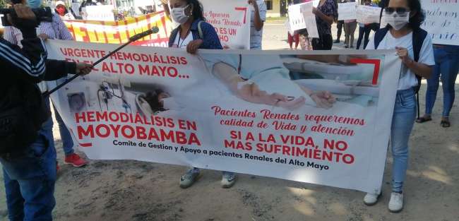 Los manifestantes mostraron pancartas y gigantografías con lemas y mensajes de los sacrificios de sus familiares para dializan tres veces por semana, sin embargo, al no haberse ratificado el convenio con los centros de atención ubicados en Moyobamba, deben viajar a Tarapoto, lo cual les genera un gasto promedio de 600 soles por semana y el riesgo de contagiarse de Covid-19, enfermedad que en los últimos 15 días acabo con la vida de 07 pacientes renales.