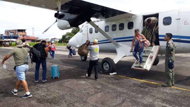 A las dos de la tarde partió el primer grupo desde Tarapoto hacia Yurimaguas, el vuelo duró 20 minutos llevando consigo 16 pasajeros quienes al arribar al aeropuerto Moisés Benzaquen Rengifo mostraron su agradecimiento a la Fuerza Aérea del Perú por brindar apoyo cívico en un momento de emergencia.