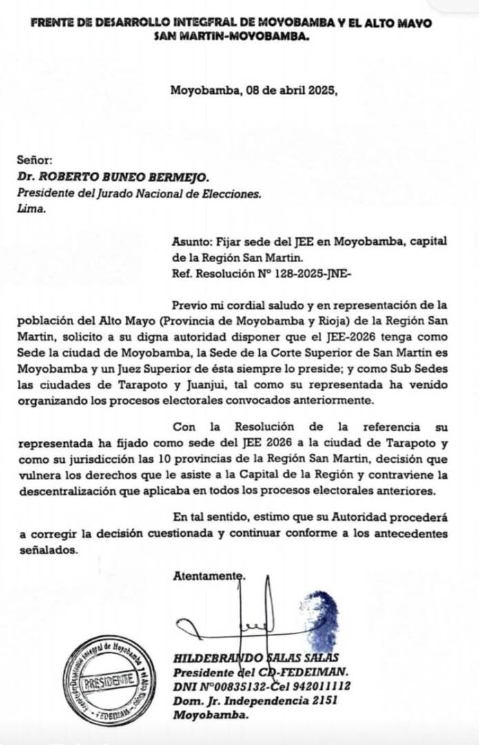 “Solicito a su digna autoridad disponer que el JEE-2026 tenga como sede la ciudad de Moyobamba. La sede de la Corte Superior de San Martín es Moyobamba, y un juez superior siempre la preside…”