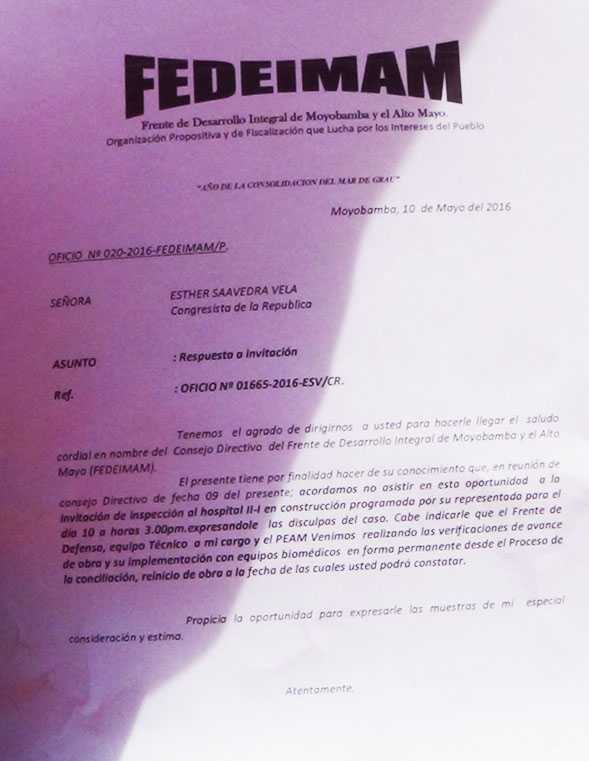 Moyobamba. El Frente de Defensa de los Intereses de Moyobamba y el Alto Mayo (FEDEIMAM), determinó no asistir a la invitación hecha por la congresista Esther Saavedra Vela, fijada para las tres de la tarde de ayer martes a fin de realizar una inspección a los trabajos que realizan en la obra del nuevo Hospital II-2 MINSA – Moyobamba.