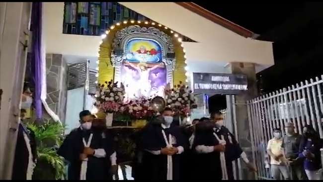 El anda del Señor de los Milagros recorrió la noche del jueves las calles adyacentes a la plaza mayor de Tarapoto, los fieles creyentes lo acompañaron. Debido a la pandemia del coronavirus, el año 2020, la iglesia católica prohibió a nivel nacional la realización de este tipo de actividades.