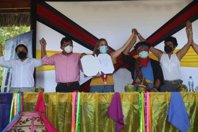 Ayer por la mañana durante una sencilla ceremonia realizada en la plaza de la Comunidad Nativa Wayku, en la provincia de Lamas, la Presidenta del Congreso de la República, Maricarmen Alva Prieto, firmó la autógrafa de la ley de Protección y Desarrollo Integral de las Niñas, Niños y Adolescentes que se Encuentran en Situación de Orfandad, la cual fue aprobada hace algunos días en el Congreso y beneficiará a más de 83 mil menores de edad que quedaron huérfanos a causa de la pandemia y también de feminicidios.